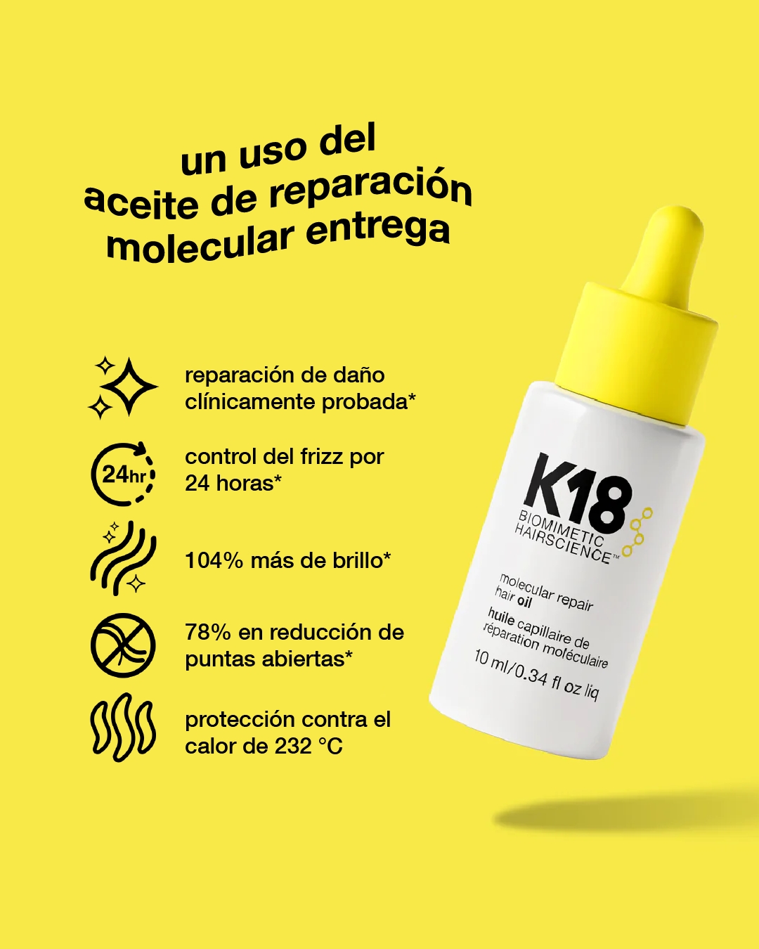 El aceite de reparación molecular actua en dos niveles de la hebra capilarpara combatir el frizz.
