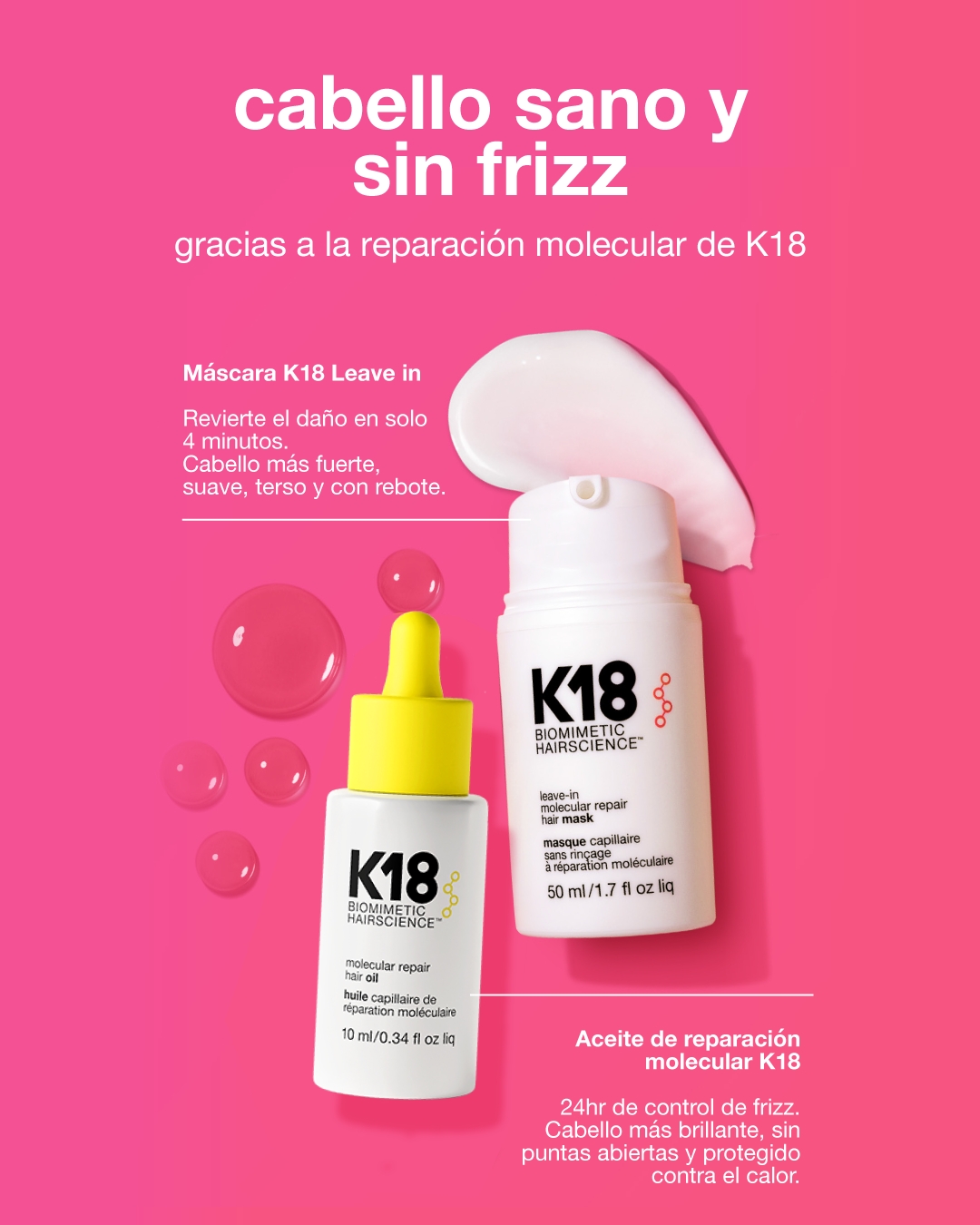 K18PEPTIDE™ repara el daño en lo más profundo del cabello que provoca el frizz, fortaleciendo y brindando suavidad mientras reduce el frizz y las puntas abiertas. En la superficie del cabello los aceites naturales de palta y girasol, y el hemiescualeno y el escualeno nutren mientras reduce el frizz y los cabellos sueltos para mejorar la vitalidad del color, resaltar el brillo y brindar protección contra el calor de 232ºC